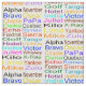 Here's the phonetic alphabet printed in a lot of different colors (same font) tiled all over this fabric. This can be used for Ham Radio, Military, etc. for many types of projects from curtains, pillows to quilts. You can buy this on the fabric you need for your project. Designed by Sheila Cicchi, Brownielocks.com, All Rights Reserved.
