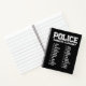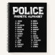 The cover displays the full police phonetic alphabet from Adam to Zebra, while the lined interior pages offer space for call-sign practice, communication drills, class notes, procedures, codes, and patrol preparation. The durable black spiral binding gives it a strong, tactical look and keeps pages flat for easy writing.