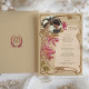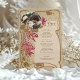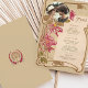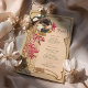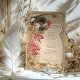 This vintage-inspired Art Nouveau wedding dinner menu captures the timeless elegance of the era with its graceful floral illustrations and intricate design. The front of the menu features a beautiful woman adorned with flowers, framed by flowing lines and warm earthy tones of beige, gold, and blush. Delicate purple and magenta accents in the flowers add a touch of colour, while the soft vintage background enhances the classical aesthetic. The reverse side includes a minimalist emblem that complements the front’s detailed art. Perfect for couples looking for a unique, art-inspired wedding stationery that exudes old-world charm and sophistication.
