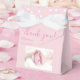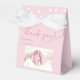 A photo baby shower party favour box. Thank you elegant script typography. Personalise the name and the date. Pink colours for a baby girl babyshower party celebration. Great party supplies for a new baby. There is a white star pattern on the back side of the favour box.