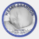 Personalised modern baptism photo stickers- Elegant blue circular frame around baby's photo. Name in curved, matching dark blue letters at top of photo and Baptism in all capitals with custom date curved at bottom against faux silver bokeh look background. Simple, minimalist gender neutral photo baptism stickers to go with any decor for either boy or girl. Other personolized baptism sticker designs are in our Zazzle.com/angela65 shop. Great as personalised baby shower stickers, birth announcement envelope seals, or baby birthday party favours, too. Click Customise option to change text colours, size, and font styles.