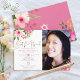 Be proud, rejoice and showcase this milestone of your favourite Bat Mitzvah with this sophisticated, personalised photo invitation! A chic, stunning, pink and peach floral watercolor with faux gold foil script typography modern dusty rose and grey sans serif type overlays a white background on the left side, your personalised photo on the right. Additional watercolor flowers and a cream Star of David overlay a dusty rose pink background on the back. Personalise the custom text with your Bat Mitzvah’s name, date, and venue information. Guaranteed to add stylish fun to her special occasion!