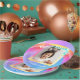 Child's Birthday Party Plate with a soft, rainbow, watercolor look background, with text. Just add your personal message at the personalise prompt, then select colours at the customise prompt. HAMbyWhiteGlove aka HAMbyWG