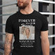 Elegant funeral memorial t-shirt featuring a picture of your lost loved one, the text "forever in our hearts", their name, birth/death dates, and the remembrance saying "gone but not forgotten".