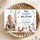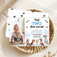 Cute dog themed 2nd birthday invitation featuring various dogs, balloons, party hats and bone illustration. This bad two the bone birthday invitation also features some black paw prints and your little boys photo on the side.