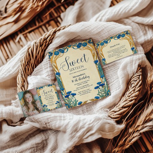 Photo Blue Cornflower Art Nouveau Sweet Sixteen Invitation