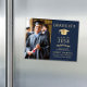 Elegant dark blue college graduation announcement magnetic card featuring a photo of the graduate, a gold grad cap, the grad's name in classic gold serif typography, and their school, major, honours or future plans.