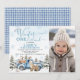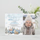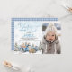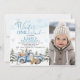 Cute winter onederland themed first birthday invitation with a photo on the front, featuring a bear, blue truck and pine-tree forest and other woodland animals.