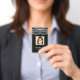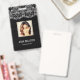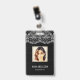 Modern photo business ID identification card with barcode over white floral lace background. Additional information can be added to the backside of this business ID badge