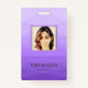 Modern photo business ID identification card with barcode over lavender and purple polygonal background. Additional information can be added to the backside of this business ID badge