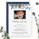 My condolences on your loss. Exquisite blue and sage foliage Memorial Service Announcement, Funeral Service Announcement invitation. A practical and delicate way to inform family and friends of funeral or gathering plans celebrating the life of your departed loved one. Card with loved one photograph showcased by graceful blue and sage green foliage arrangement and use of modern hand written Calligraphy details. Back of card in elegant navy blue colour that can be changed to any other colour you prefer by selecting customise further. Coordinating funeral guestbook available. Part of our "Rustic Blue Mountains" wedding and events collection.
