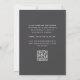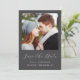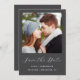 This simple, minimalist Save the Date card features a square photo above the words "Save the Date" in elegant white handwriting script, followed by the couple's names, wedding date and city in sans serif font on a charcoal grey background. Add a more detailed message with additional information on the reverse, along with a QR code to help your guests visit your wedding website.