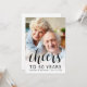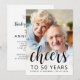 The front of this 50th wedding anniversary party invitation features a photo of the couple with a black text overlay. The word "cheers" appears in elegant calligraphy script, followed by "to 50 years," along with the guests of honor's names and the date in sans serif font. A white screen helps make the text pop. Customize the reverse side with the names and party details on a white background. A great way to help a special couple celebrate their golden anniversary!