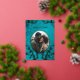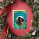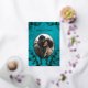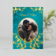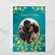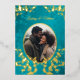 This elegant wedding invitation features a round photo surrounded by real gold foil cherry blossom branches on a shimmering floral turquoise background. Bride and groom names in an elegant classic script.