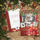 Pretty holiday greeting card with a pretty red and gold bokeh lights background. Adorned with gold glitter snowflakes, pine branches, red baubles and bright string lights.