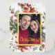 This elegant Christmas photo card features a beautiful frame of hand-painted watercolor greenery, flowers, and berries with a real gold frame and an elegant script. The back includes the same artwork with a second photo and text for personalising your message. Find matching items in the Christmas Holiday Poinsettia Collection.