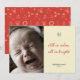 Silent night Christmas cards featuring the words "all is calm, all is bright", in red text, on beige/ivory backgroud, adorned with blue snowflake, and a photo template of newborn baby crying. The back of these simple Christmas photo cards feature a festive/fun red pattern, with Santa, christmas tree, snowman, holly, wreath ...
