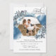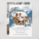 Gorgeous Virtual Wedding invitation card with four photo, elegant blue watercolor stains cascading behind geometrical photo frame with exquisite blue floral and foliage details. Use of modern hand written calligraphy details. On the back three photo collage with elegant small frame with your initials joining all three photographs together. Part of our "Rustic Blue Mountains Collection" with a variety of coordinating products available.