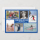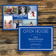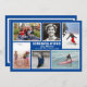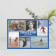 Navy blue photo collage graduation announcement and open house invitation. Double-sided flat cards with six places to share photos of the boy or girl grad. Photos are vertical, horizontal and square. Pictures from his or her life can show favourite hobbies, talents, friends, and siblings. The centre holds the “congratulations” text with his name, class and school name. Each photo is framed in white. On the back, customise lines of text for the open house, or your choice of celebration. The blue background colour can be changed in the “customise” area. Be sure to change it for both sides of the card.