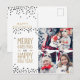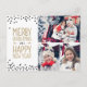 Festive Christmas greeting card design with trendy white and black snow elements. A big elegant golden typography text on the front with "Merry Christmas and a Happy New Year". And a stylish photo collage frame for 3 personal photos and pictures of the family. Create this popular design from Luckz.