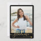 3 Photo Collage Graduation Announcement for High School or College Graduation Ceremony details and Open House Invitation features a modern and bold calligraphy script with sans-serif Class of 2025 font and room on the back for 2 additional senior photos or travel pictures on a minimalist black and gold background with optional rounded corners.