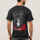 Modern photo t-shirt shows a black french bulldog - 'frenchie' sitting on a red pillow. Bulldog is on both front & rear sides.