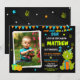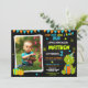 Features cute green T-Rex with party hat, chalkboard background with bright colors and dinosaur footprints. Perfect for boys or girls dino-themed birthday parties. Playful design with bunting and paw prints. Great for kids who love dinosaurs, T-Rex, and prehistoric adventures. Create a roaring good time for your little dinosaur's special day!