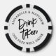 These custom poker chips feature your photo on one side for a personal touch, making them a unique keepsake. The other side is styled as a drink token with the bride and groom’s names at the top, “Drink Token” displayed in the centre, and “One Free Well Drink” at the bottom.
