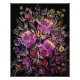 A vibrant painting of lilac flowers on a dark background in the traditional Petrykivka style. The composition features intricate floral patterns, with delicate, sweeping brushstrokes that create a sense of movement and elegance. The flowers are surrounded by ornate leaves and small decorative details in shades of green, yellow, and white, contrasting beautifully with the dark backdrop