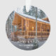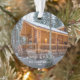 Commemorate your first Christmas in your new home with this beautiful modern keepsake ornament. The white text reads "First Christmas in our new home," with the words "new home" in elegant handwriting script with flourishes before and after. Replace the sample image with a photo of your new house and add your family's last name. A dark gradient filter helps make the text pop.