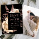 This elegant, moody wedding Save the Date card features a lush, romantic floral bouquet in ivory with rose gold faux foil and glitter foliage on a black background. Customise the rose pink text in stylish fonts on a black rectangle, and add your favourite vertical photo to the back.