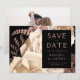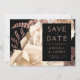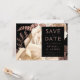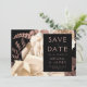 This elegant, moody wedding Save the Date card features a lush, romantic floral bouquet in ivory with rose gold faux foil and glitter foliage on a black background. Customise the rose-coloured text in stylish fonts on a black rectangle, and add your favourite horizontal photo on the back.