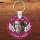 Editable girly memorial funeral keychain featuring a heart photo of your lost loved one, angel wings, the sympathy saying "in loving memory", their name, and birth/death dates.