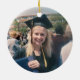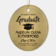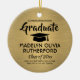 Commemorate the graduate's achievement with a custom photo black and gold round graduation Christmas ornament. Picture and all text are simple to customise. Include school name and degree, congratulations, thanks mum and dad, or other message of your choice. Design features a gold faux brushed metallic background, black graduation cap, personalised modern typography name, school, & class year, and one photo of your choice, such as a senior picture or image from the commencement ceremony. Makes a thoughtful keepsake gift idea and an elegant addition to Xmas home decor. Congratulations to the graduate!