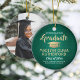 Commemorate the graduate's achievement with a custom photo green, gold and white round graduation Christmas ornament. Picture and all text are simple to customize. Include school name and degree, congratulations, thanks mom and dad, or other message of your choice. Design features a green faux brushed metallic background, faux gold foil graduation cap, personalized modern typography name, school, & class year, and one photo of your choice, such as a senior picture or image from the commencement ceremony. Makes a thoughtful keepsake gift idea and an elegant addition to Xmas home decor. Congratulations to the graduate!