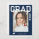 Photo Graduation Party Elegant Modern Script Invitations feature your favourite photo with the simple white text "Grad (year)" and your name and personalised graduation details on the front on a blue background. On the reverse add an additional picture with your graduation invitation information below. Personalise by editing the text in the text boxes provided. Created by ©Evco Studio www.zazzle.com/store/evcostudio