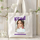 Photo Graduation Party Elegant Modern Script Tote Bag feature your favourite photo with the simple purple text "Grad (year)" and your name and personalised graduation details on the front. Perfect for the grad as a graduation gift or graduation party decor. Created by ©2023 Evco Studio www.zazzle.com/store/evcostudio