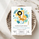 Safari animals or party animals themed first birthday invitation for a baby boy featuring three cute jungle animals and a leaf and floral wreath. This calling all party animals 1st birthday invitation also features a faux gold glitter number and a photo on the back.