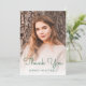 Trendy modern birthday thank-you card featuring a custom vertical photo. The words "Thank You" appear in green handwriting script overlay, with the name below in sans serif font. Easily replace the sample image with your favourite photo. A white gradient screen helps ensure the text pops. The reverse side features a green dripping faux glitter border on an ombre background. Customise the text with your own thank-you note, or delete it to provide room for individual handwritten messages.