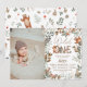 Wild one! An adorable and cute hand painted watercolor country rustic greenery forest animals woodland photo 1st birthday party invitation featuring cute bear, deer, racoon, rabbit, hedgehog and a fox in neutral woodlands colour, in orange, green, brown colours. with greenery leaves and tree branches. Perfect gender neutral baby first birthday invitation for all seasons!
