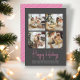 Four photograph happy holidays Christmas holiday flat cards. Personalised with your own 4 photographs and text from Ricaso .. add your own details to these simple cards that will make an impression - designed with a handwritten script and a stripped pattern to the back in grey and pink