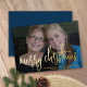 A modern look for a holiday photo card. A gold foil word - merry christmas - is on top of the photo and holiday greeting.
