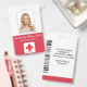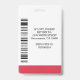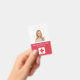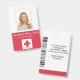 A modern simple medical professional name photo ID red white badges professionally designed as an online template for a healthcare facility or hospital with ability to replace the staff photo, logo template, employee's name and professional title. At the back add more information such as return address, bar code and the employee's ID number. Great for round shaped company logos.
