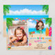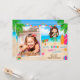 Cute invitation Hawaiian style for girl's birthday featuring brunette girl, surfs, tropical beach and blue ocean, aloha sign, and some tropical party equipment.