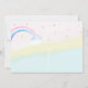 This Mermicorn party invitation features golden mermicorn, small dolphin, rainbow with a cloud, some stars and shells around.