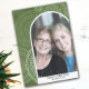 A modern Merry Christmas photo card in shades of olives and greens. The photo are is a mod arch with a white border. The modern design includes stripes and classic type for the main part of the text.