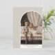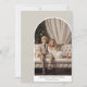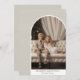 A modern Merry Christmas photo card in shades of taupe. The photo are is a mod arch with a white border. The modern design includes stripes and sans serif type for the main part of the text.