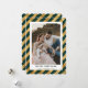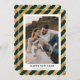 Elegant green and gold photo Happy New Year card featuring modern stripes, snowflakes and stars. Easily personalise online. The gold foil effect is only simulated in the artwork.