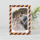 Elegant red and gold photo New Year card featuring modern stripes, snowflakes and stars. Easily personalise online. The gold foil effect is only simulated in the artwork.