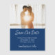 A Wedding Save the Date magnet card with a navy blue background and white lettering. Add your photo, your names, wedding date and city/state. Four fields can be personalised to make it your own.